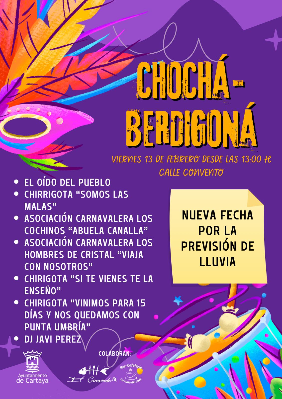 En Cartaya, el Carnaval llega con la tradicional Chochá Berdigoná, una cita ya imprescindible que reúne coplas, agrupaciones y mucho sabor carnavalero.