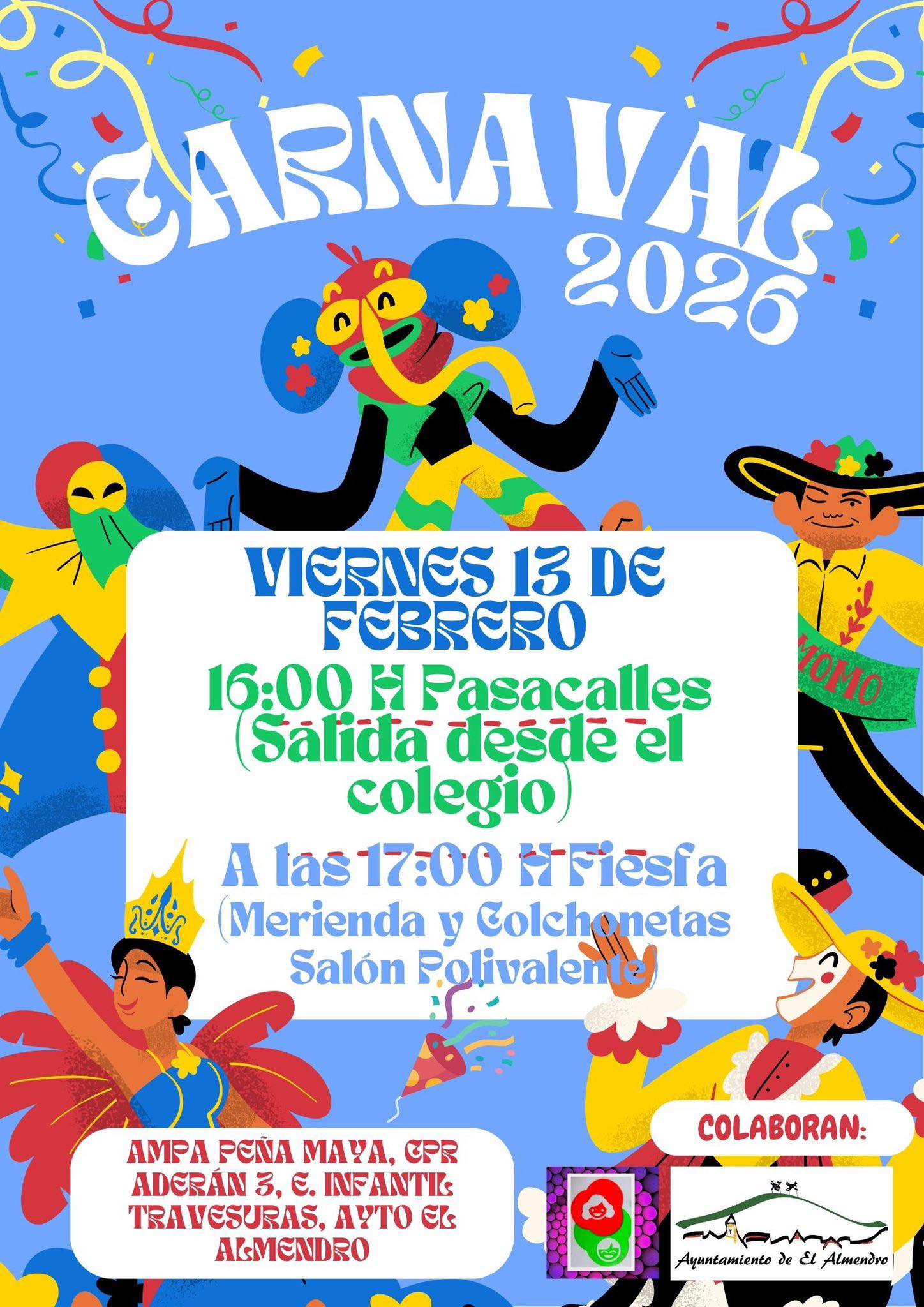 El Almendro celebra su Carnaval con pasacalles, merienda, colchonetas y una gran fiesta familiar pensada para pequeños y mayores.