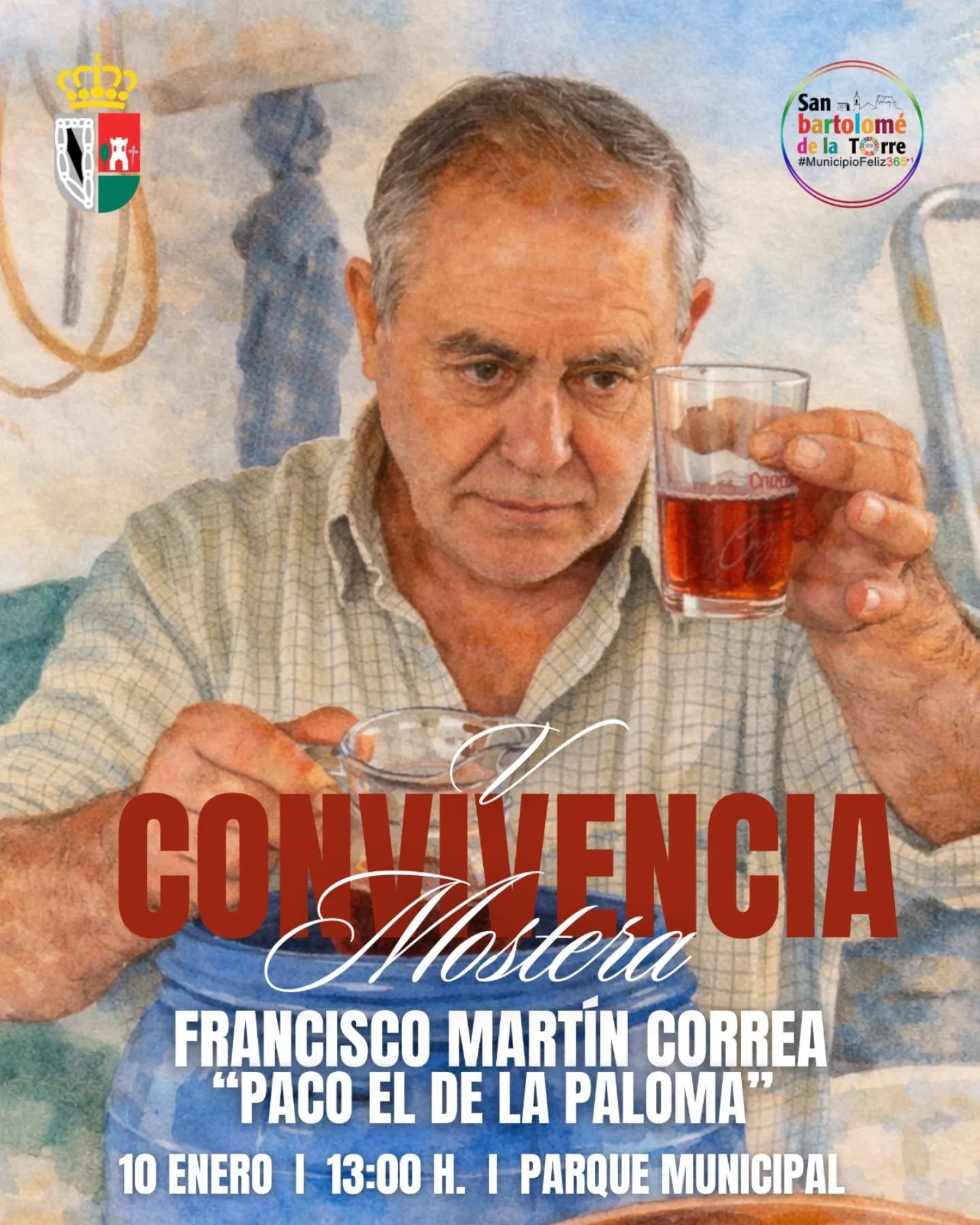 El Ayuntamiento de San Bartolomé de la Torre celebra la V Convivencia Mostera, un encuentro dedicado a poner en valor una de nuestras tradiciones más arraigadas y a rendir homenaje a Francisco Martín Correa, conocido como “Paco el de la Paloma”.